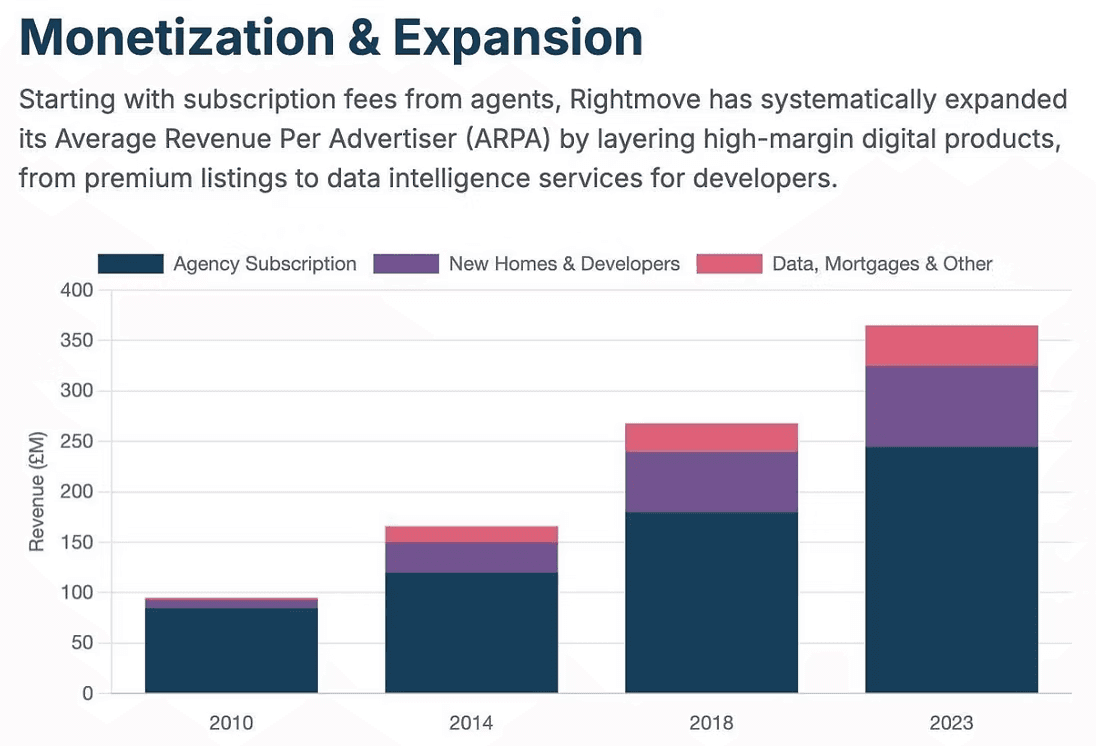 Importantly, this dominance has survived waves of threats. This chart highlights the Relative Market Share gap. Rightmove attracts multiple times more consumer time and traffic compared to Zoopla and OnTheMarket, underlining why rivals struggle to dent its position. Zoopla became a solid number two by acquiring 5 smaller property portals (2007-12), while OnTheMarket was launched by agencies specifically to provide a lower cost alternative. Even after spending £46M on advertising in 2024 - about 3x the level of Rightmove, it is hard to perceive a dent in Rightmove’s growth trajectory. Consumers still turn to Rightmove first because it has the most complete set of listings, and agents cannot afford to be absent from the place where most buyers are looking.