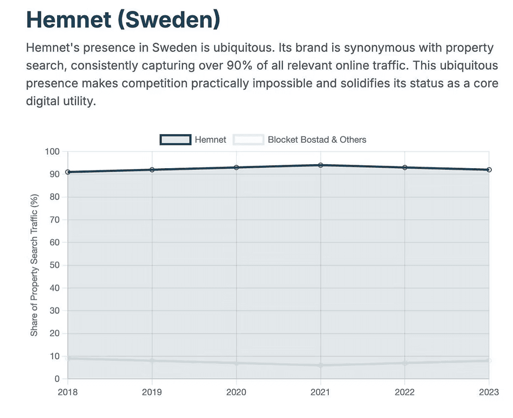 This chart shows Hemnet’s overwhelming lead in Sweden, with traffic often 10 to 20 times larger than Blocket’s property vertical. This attention advantage has made Hemnet indispensable. Blocket Bostad, backed by Schibsted, tried to leverage its strong horizontal classifieds presence to compete. Despite significant resources and brand recognition, it failed to displace Hemnet because users seeking property prefer the depth and liquidity of a specialist portal. Regulators even blocked a potential Blocket acquisition of Hemnet, cementing Hemnet’s role as the goto platform.