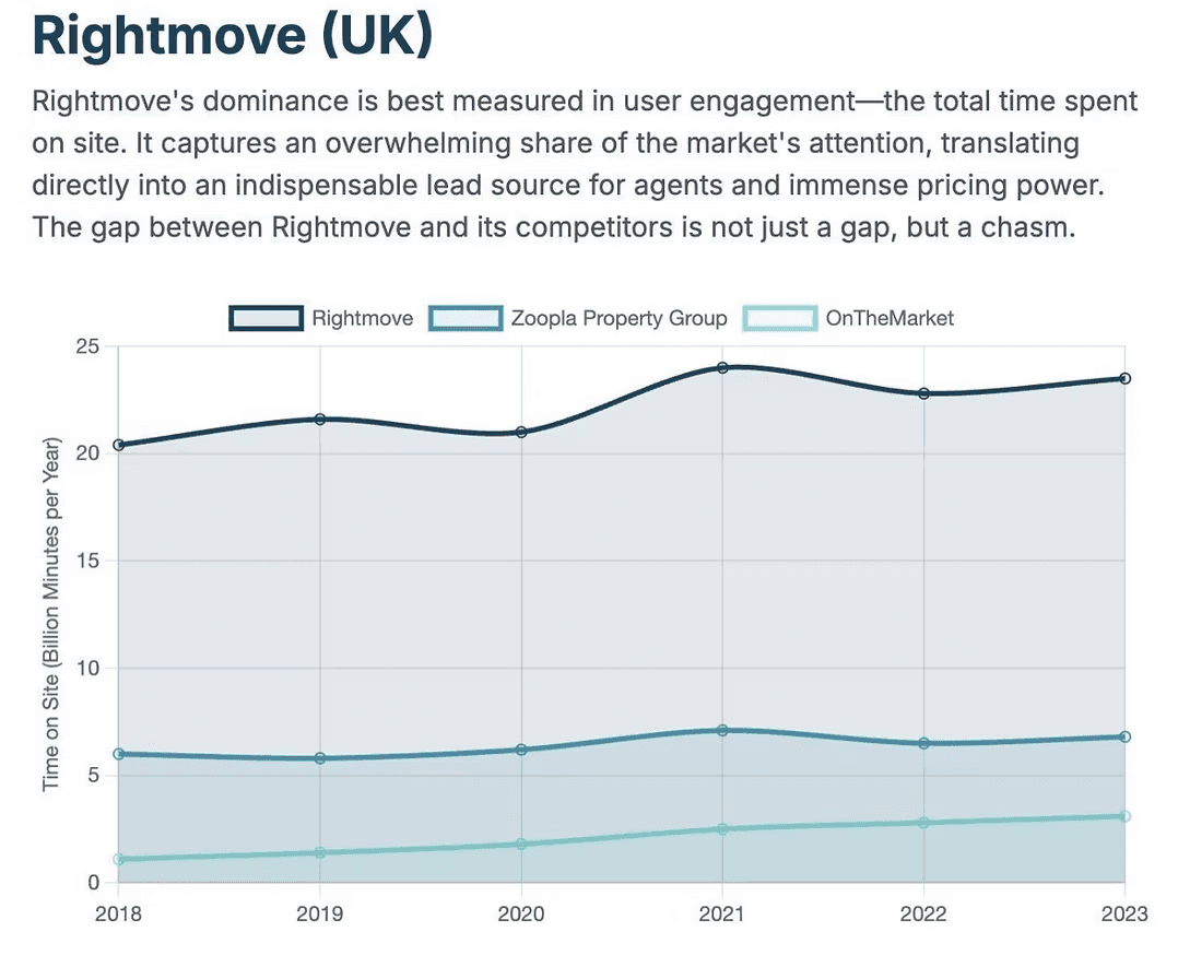 Rightmove is the definitive case study in network effects. By 2024, over 80% of all time spent on UK property portals was on Rightmove. The company delivered more than 7 of every 10 vendor instructions and 8 of every 10 lettings leads generated by UK portals. For estate agents, being absent from Rightmove is not an option. It is arguably akin to running a shop without a sign.