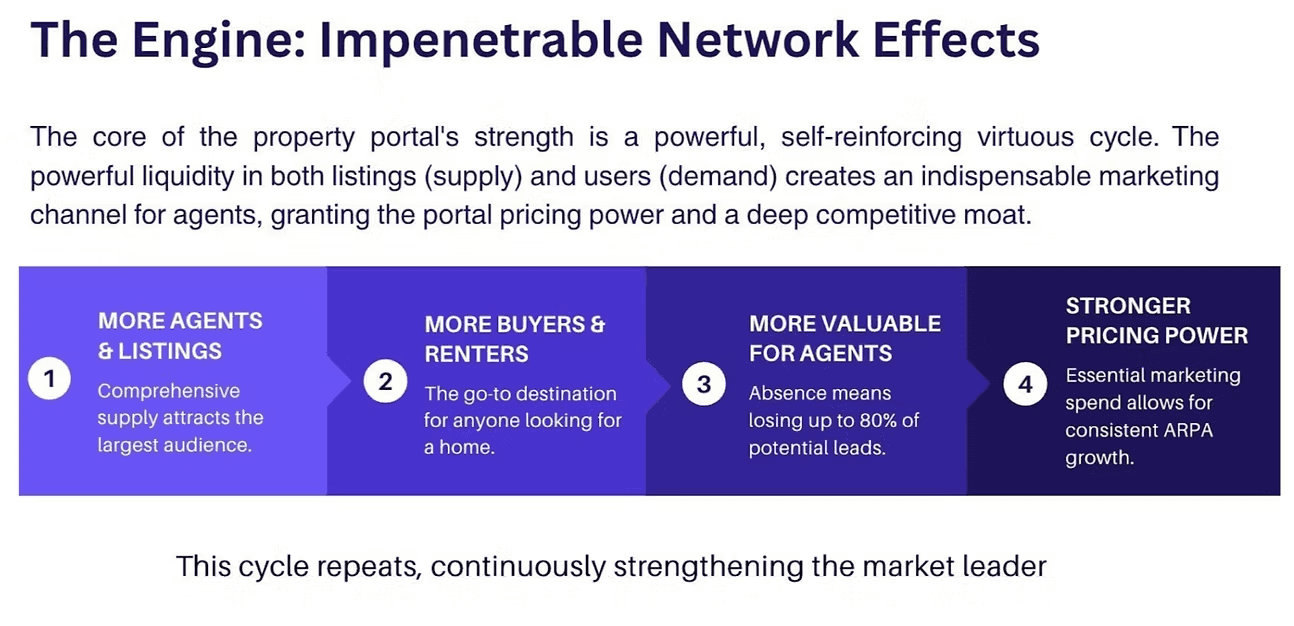 At their core, property portals thrive on a two-sided network effect. Buyers congregate on the site with the most listings, while sellers (agents, developers, or homeowners) want to list where the buyers are. This self-reinforcing loop creates a liquidity density that is defensible not just at the national level but usually within every local micro-market. Once one platform establishes dominance, it becomes the de facto “digital utility” for property search. Brand, consumer habit, and the power of data compound to create a fortress.