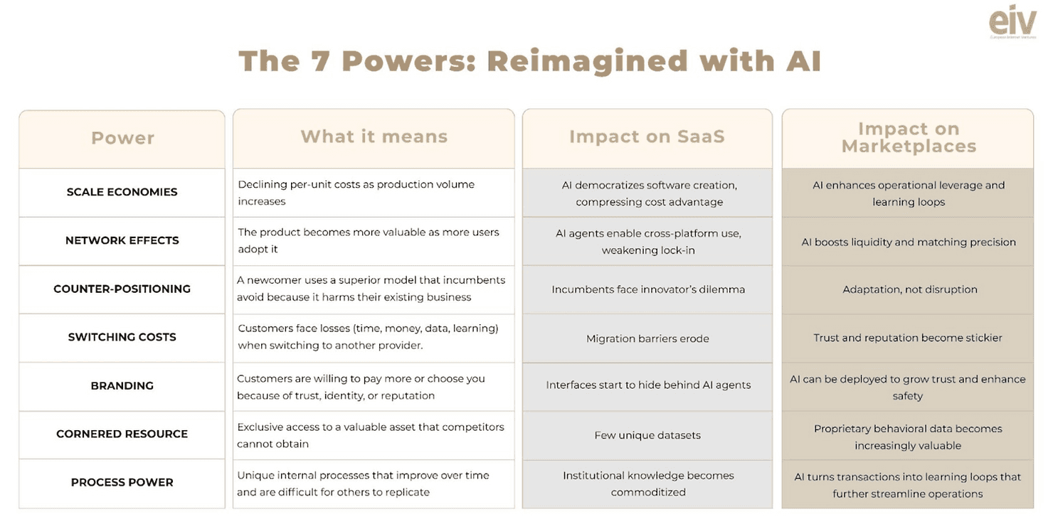 In our last post, we took a look at Hamilton Helmer’s 7 Powers, the definitive lens for understanding durable advantage. We argued that when comparing Saas with Marketplaces, the latter consistently build deeper, more durable moats based on deep network effects, reputational switching costs, vast data resources, and process power. We ended with a critical question: how does AI change this framework?