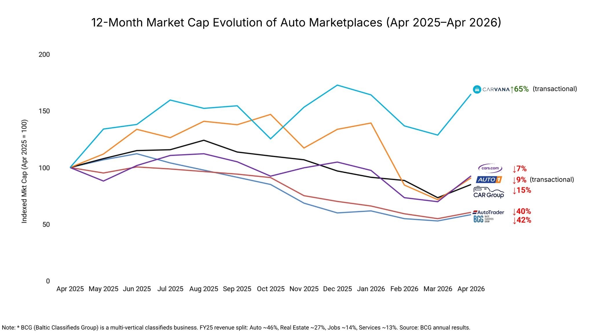 The transactional vs. subscriptions model share price variance over the last 12 months is well illustrated and within the Auto vertical. Carvana (transactional) is up 65%, while Auto1 (also transactional) is down (just) 9%. Carvana owns the full operating stack: inventory, financing, logistics, returns, warranty. Auto1 runs a C2B model that connects consumer sellers to dealer buyers, with less inventory risk; their B2C business accounts for little more than 10% of total sales. The auto classifieds cluster (predominantly subscriptions-based) has moved in the other direction: AutoTrader UK -40%, BCG (a generalist and multi-vertical with 46% automotive revenues) -42%, CAR Group -15%, Cars.com -7%. The within auto sector divergence is the cleanest indicator that the resilience gap is more about business model than industry exposure.