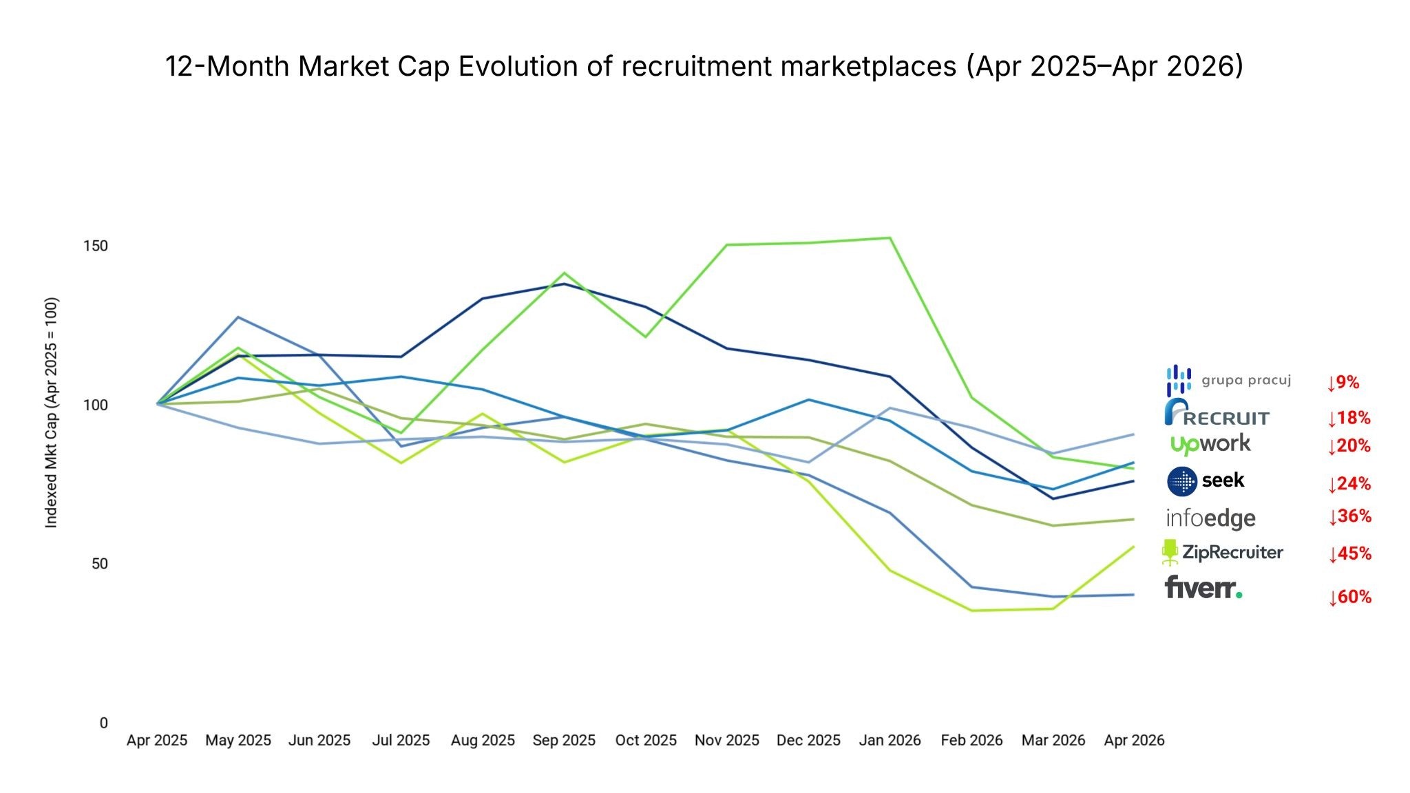 Unlike car and real estate classifieds players, wherever they are, recruitment classifieds have to contend with an increasingly AI-enabled LinkedIn and Indeed. In the case of ZipRecruiter, the decline has been brutal. The company listed at a $2.2 billion valuation in 2021. It trades below $250 million today, a near 90% decline. Revenue fell from $905 million in 2022 to $449 million in 2025. When it announced a ChatGPT integration in March 2026, the stock fell further. The market is betting that AI native challengers - including those using LinkedIn and GitHub as their “CV database” are better placed to provide the end-to-end recruitment service employers are increasingly demanding. AI-native challengers like Mercor, Findem, hireEZ and Jack & Jill are likely to pick up that demand.