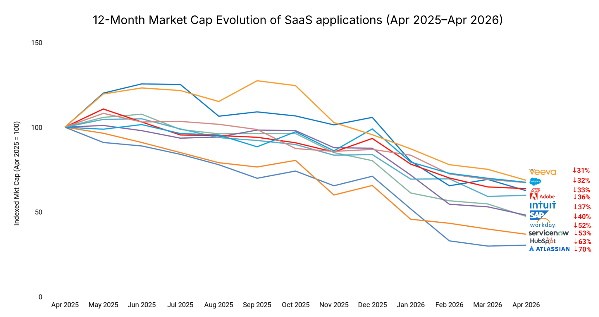 Even Salesforce, the relative outperformer, is down a third. The customer-record lock-in that defined Salesforce’s defensibility still has some structural value, but even that is being tested.